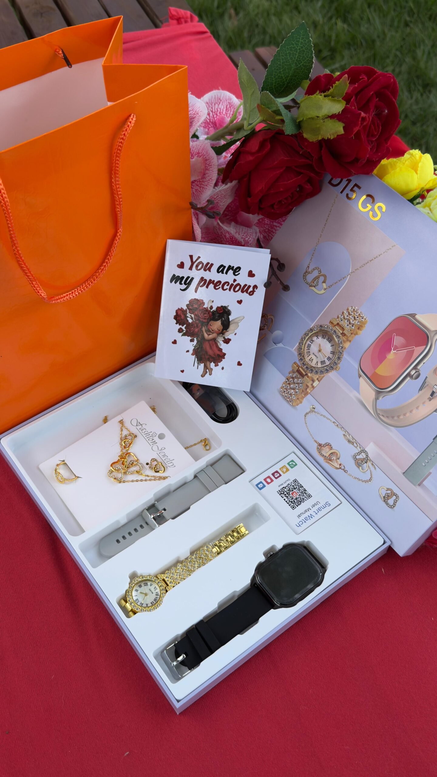 The set includes a SmartWatch, iced watch, necklace, earrings, and ring, making it a complete accessory collection for everyday wear or special occasions. To make the gift even more meaningful, we offer custom engraving for a personal touch. Finished with a gift card and gift bag, this set is perfect for Valentine’s Day, anniversaries, or romantic surprises.